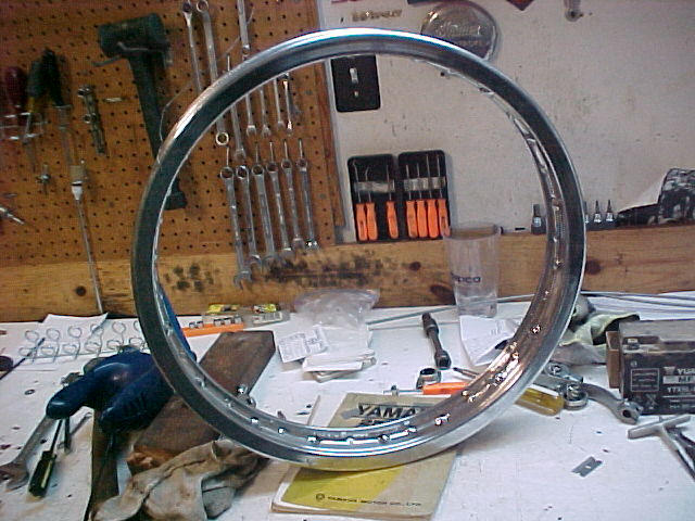 I think the wheel in the first pic is from a CB450, or early CB350, as the brake is smaller. You need a 66-7, large hub front wheel for your bike. It does have the aluminum sliders. I have a decent rim, a complete set of re-plated in canium spokes, and I could polish up a hub and lace them all together for you. Here's some pics of rim. Not show quality by any stretch, but good for a rider.