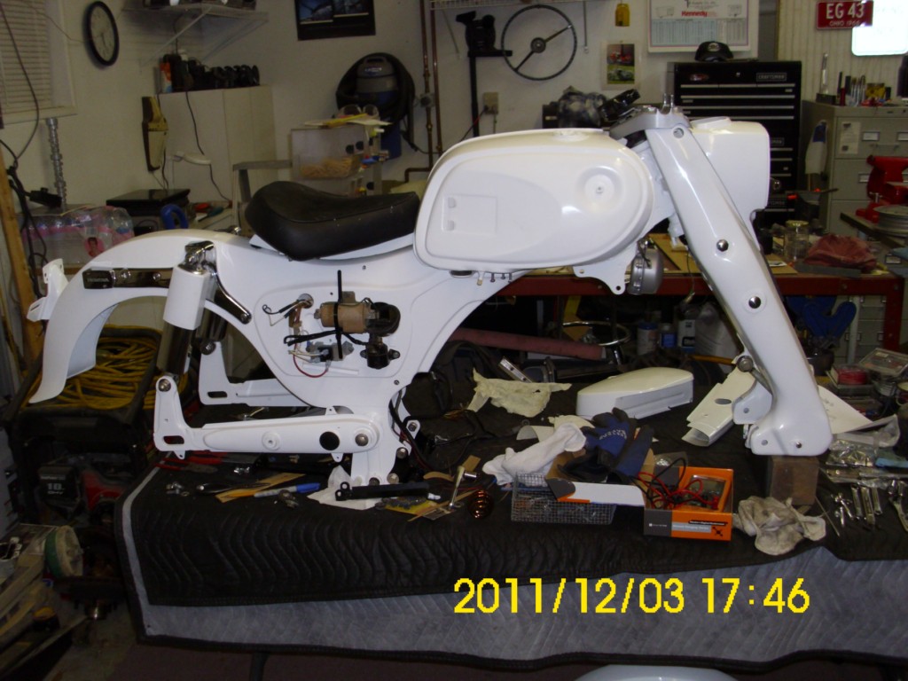 Your bike is coming along nicely! Love the color!!!! :) I like the seat on your bike too. I think I like the curve of your seat a little better than mine. It accentuates the lines of the frame nicely. Well done! Keep us posted on your progress. We are still having issues with getting mine to start ROUTINELY!!! We had a small oil drip that we had to address before going any further, and then we will try to find tune this thing. I bought one of those Wisco batteries (blue and clear ones) because I liked the nostalgic look of it and the fitment was PERFECT! However, I don't think it is the best choice for batteries as far as getting the bike to start. It wears down quickly, and when your trying to get it to start so you can get the bike dialed in, that just isn't cutting it. Does anyone recommend a battery that will fit the early 1963 model battery holder that also had enough juice to make it FUNCTIONAL?