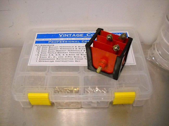 I bought a kit of electrical connections from Vintage Connections. It came with different size connectors, plastic tubes to cover the connections, and a pair of crimpers that are meant to crimp down on the wires. The kit worked great and was about $100. Part of that cost is for the crimpers. Once you have those, the connectors are sold seperately and are pretty cheap.