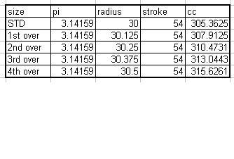Displacement equals (number of cylinders) * pi * bore radius squared * stroke all divided by 1000 to convert from mm cubed to cm cubed. The table below has displacements based on oversizes. Not sure if this is perfectly exact, but it should be close. See attached picture for table.