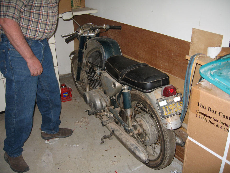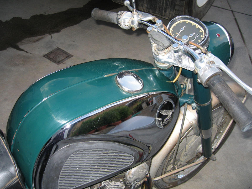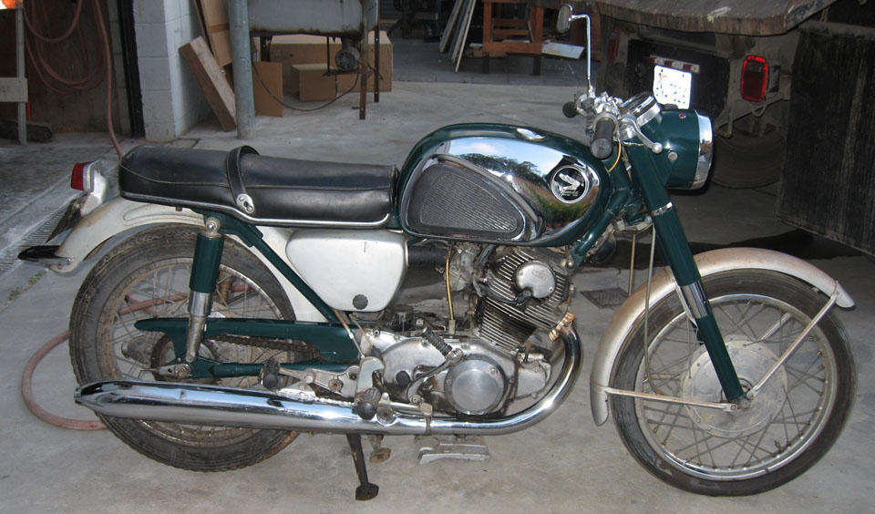 The story thus far: I bought a 1966 CB77 for $500 on Craigslist. The bike was missing some parts so I posted a wanted ad on Craigslist for a parts bike. I got a response to the effect that a guy had a 1961 CB72, he was the original owner, the bike had been off the road since the early 70's. He and his brother raced it in small town events around California from 62-65 or so, some noteworthy tracks he raced on were Laguna Seca, Vacaville and Cotati. I honestly thought this response was a joke at my expense, since a 1961 CB72 is a rare bike. A telephone conversation the following evening proved me wrong though. A week and more money than I really wanted to spend later I had a British Racing Green 1961 CB72 in the back of my truck with a box of parts that included a factory valve spring compressor tool, all 3 CYB shift linkages, 5 or 6 different rear sprocket sizes and some other neat misc. Many of the small differences between the early and late bikes can be seen in these 'As Found' pictures.