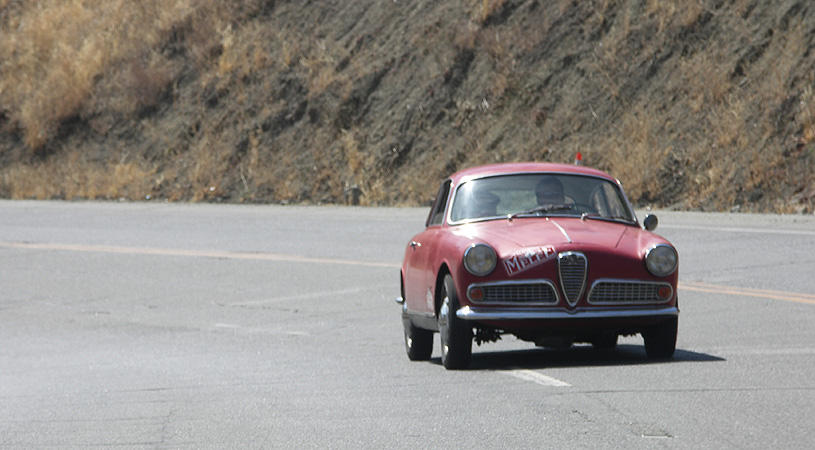 The red car is my 1959 Alfa Romeo Giulietta Sprint. Originally a 1300cc 4 speed drum brake car, it now has a 1750cc engine, a 5 speed and disc brakes all around. I have the original parts and will probably restore it some year. A totally rust free Alfa- yes that is rare!