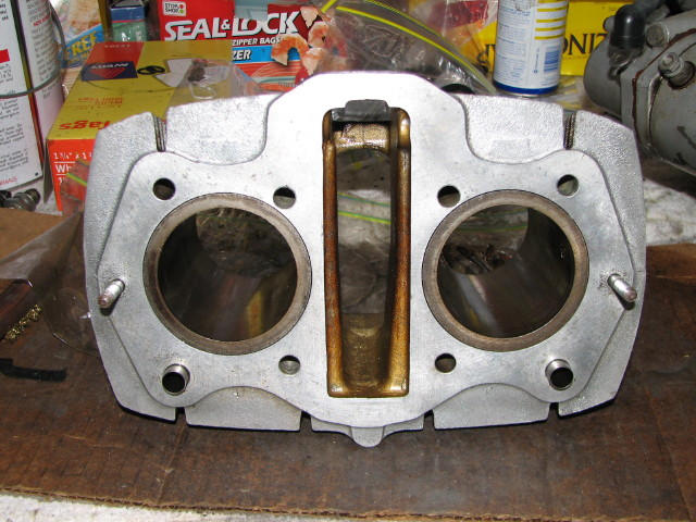 I've made a lot of progress on the motor. Carb cleaner and a brass brush work great cleaning the gasket gunk off the cast aluminum parts, as well as the ring of coke on the top edge of the cylinder liner. Note: the breather plate above the cylinder head is not the same aluminum and the brass brush does scratch it.