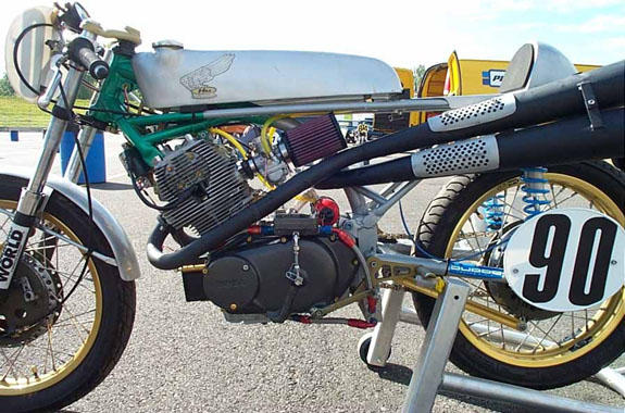"This is my bike. ...It is mostly CB72. I raced it mostly as a 250 but also as a 350. It was crashed about four years ago and has not yet been rebuilt; someday maybe. The engine has a doubled oil pump, external oil filter and cooler, and a close ratio 5-speed Nova transmission. The ignition is on the right end of the crank. The 350 head was made from a CR72 so that the combustion chamber could be reshaped to provide more squish."
