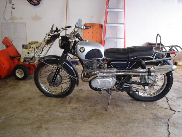 Here is a couple of pics of my Scrambler. It was originally Silver/black but the tank and fenders got painted blue. I had to boil the gunk out of the tank so I got it repainted the right color. Bike runs great and I was lucky enough to get my hands on an 8"brake setup for it so I will have some parts for sale. I do have a spare tank which is pretty good on the inside and could use some repairs on the outside. I could use a front fender brace and front fender for an 8" brake setup unless the fender is the same. I am glad to be a part of this forum. I would be interested in chatting with anyone in the Wisconsin Area or anyone in general about 305's > My love for them goes back to 1967 when I bought my first one brand new.
