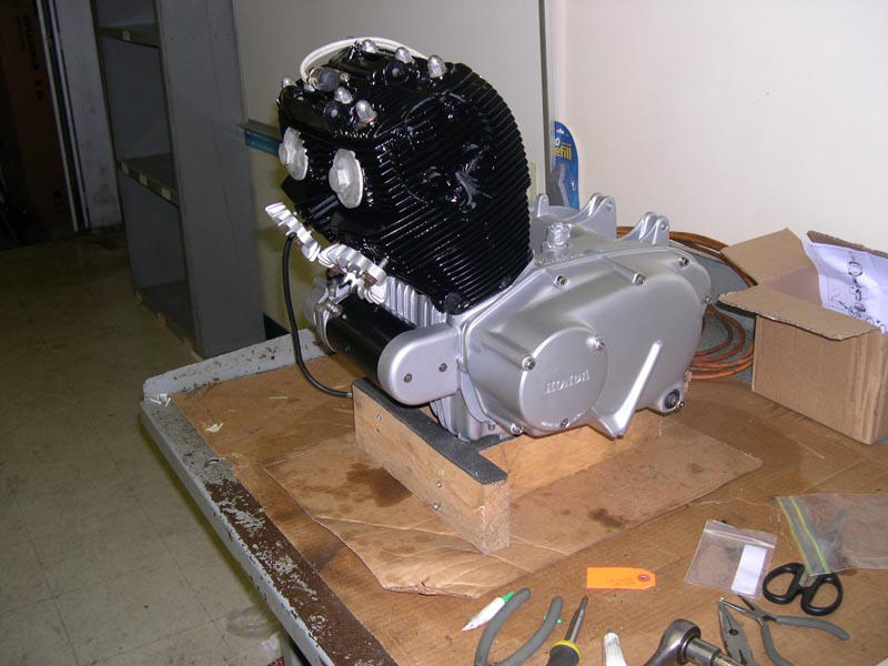 updated picture of the engine teardown/cleanup/paint progress. got the carb reassembled and bolted on last night. got the undercoating on the frame done too. off to paint the frame today .... won't be long now papa smurf !
