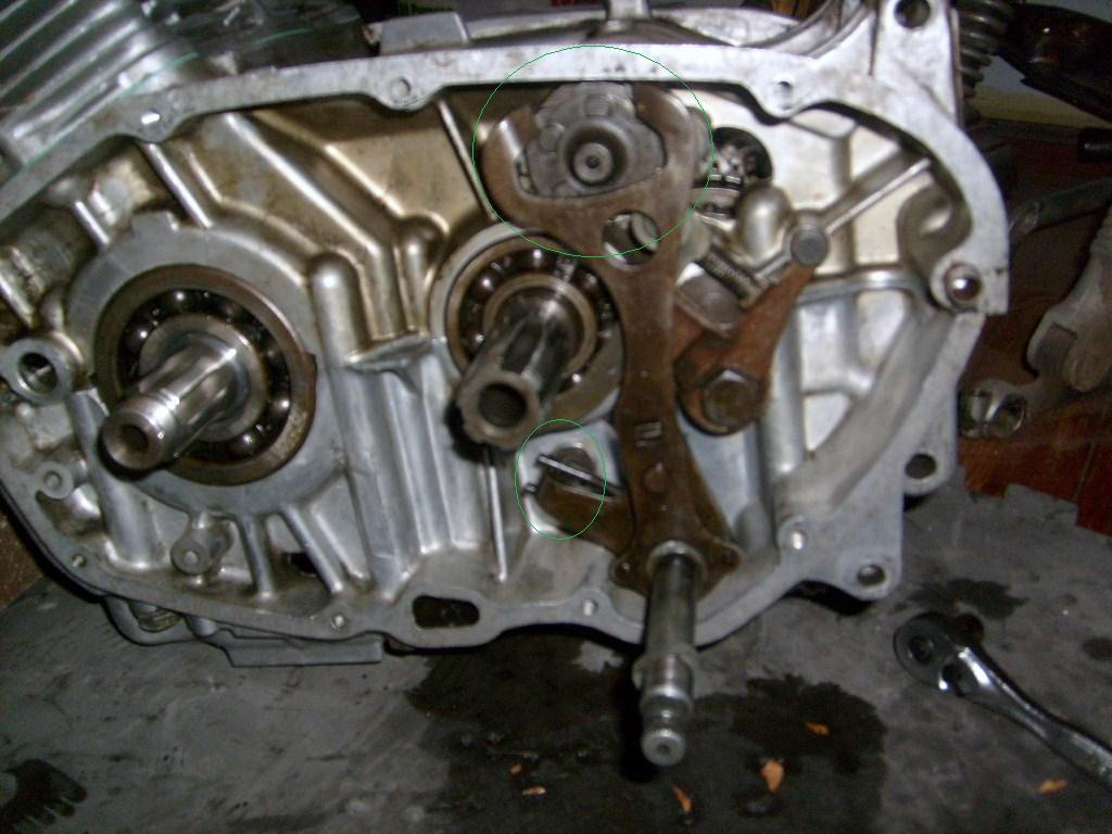 I just want to know if everything is where it needs to be before I put the clutch plates on. The two areas I'm concerned with are circled. So is the gear shift arm in the right spot on the drum and is the gear shift return spring (one part of the spring on each side of the bolt)in the right spot. Also, am I missing anything? I have too many projects and get confused on parts.