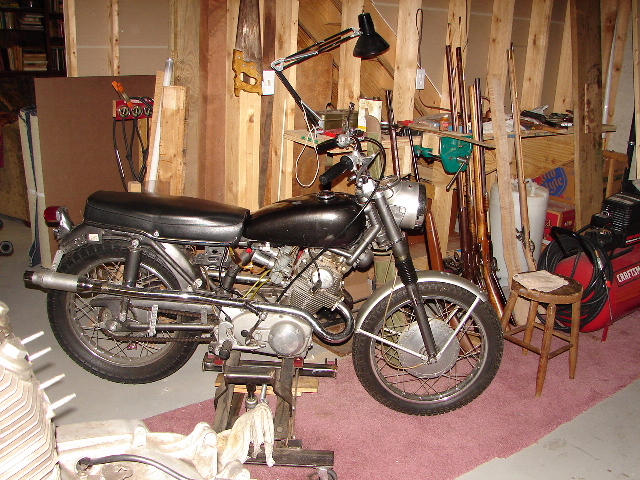 My wife went to a christening in Indianapolis this weekend and took the camera with her. I did take a couple of pics of it on the back of the Ranger when we got home. I did not have the camera to take any others. Besides, the basement is so full of motorcycles I dont know if I can get enough room to take a picture ! I will get a couple of pics and post them as soon as I can. This old bike is neat. The original owner mounted a nice little plate on the rear fender that says "1966 Honda Superhawk- 305 cc. NJ to Ca to NJ 7000 miles 1968." That stays on the bike for sure !