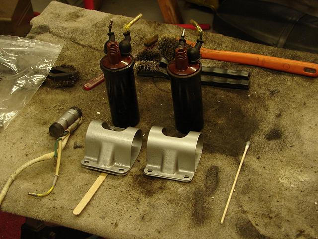 couple more pics: coils and brackets turned out nice, but the side covers look like the paint job on the old BMR R90 S ( "smoke"- remember that one ? ) Oh well, I can paint them again when it gets warmer. The pile of parts is getting smaller. Getting closer to having just the engine rebuild to finish the bike. Local bike shop can still get me a correct sealed beam headlight, and I am happy to give them the business, as little as it is. The mechanic there is a bottomless fount of information. ( and thanks to e3steve for the info posted in another section.)