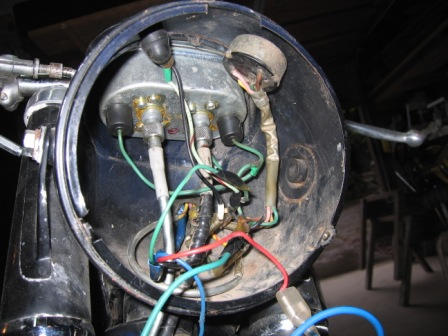 OK guys, I have a real juicy electrical gremlin problem to sink your teeth into. 1963 CB77, replaced the headlamp. Also replaced the dimmer switch with a used switch off eBay. With all the wiring connected, and with the headlight assembly laying on the front fender lamp side down and backside wiring facing up, everything works fine. With the headlight switch in middle position, main switch on, only the neutral light is on. So far so good. Switching the headlight switch clockwise, now the headlight is on and I can toggle between high beam and low beam with the dimmer switch. Speedo lamp is on also. Again, no problem so far. With headlight switch at far counter-clockwise position, taillight and speedo and neutral lamps are on, with no headlight as expected. Still everything's OK. Now, here's the good part...I pick up the headlight assembly and hang it from the headlight bucket. Turn main switch on, neutral lamp comes on. Normal. Then when I turn the headlight switch clockwise, the neutral lamp goes out. It's because I've blown the fuse. I've gone through about four fuses repeating this sequence of events. I'm guessing I have a short somewhere that doesn't manifest itself until I ground the headlight to the bucket. I don't see any exposed wires, and the pieces of electrical tape you see in the pics are just to cover the exposed metal parts of the electrical connectors, they are not the outcome of twisted wire cob-jobs. Based on the information I've provided, can someone point me in the right direction? Clearly I'm not an electrical expert, just a dangerous character with a multi-tester.