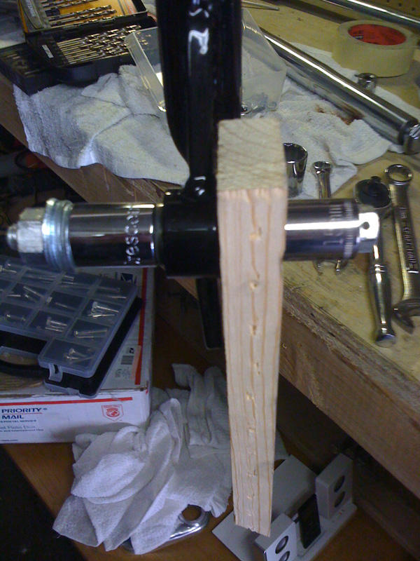 id thought i would share an easy way to get swingarm shock bushings in and out. i didnt take photos of taking them out but here are a few photos of putting them in. just drill a hole in a piece of wood, stick a bolt through it and use the proper