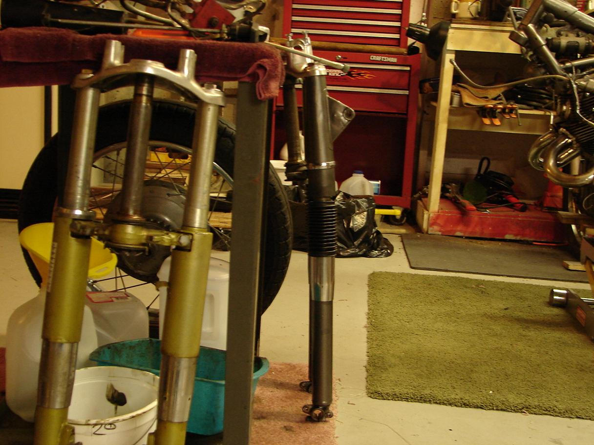 forgot to mention: there are 2 pics of forks. You can see that the early style forks met with an immoveable object. the forks with the wheel on are the replacements.