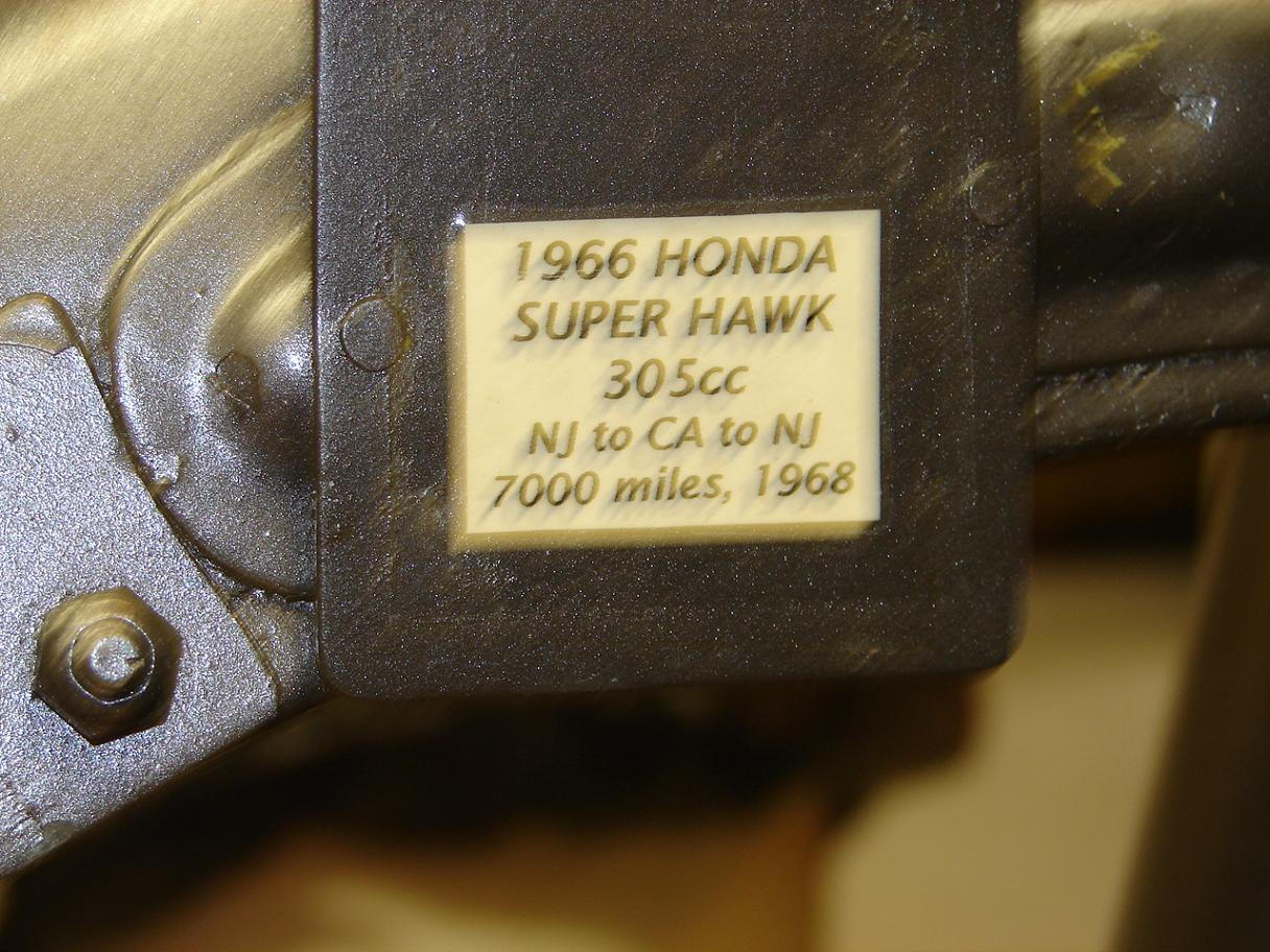 As far as the exhaust, it is home made of very heavy guage tubing of some sort: dont know about the little mufflers. The brackets that hold it clamped to the frame on each side are made of 2 Honda hand holds welded together. According to what I was told the original owner passed the bike down to his kids to learn to ride. Hence the swap on the front end to an early style front forks, headlight bucket, speedo. Many other mods to bike also ( BUT it will start ! Has no electric starter, but kicker lights it up just fine !) See attached of what it looked like on the back of my truck, and also of the plaque on the side of fender.