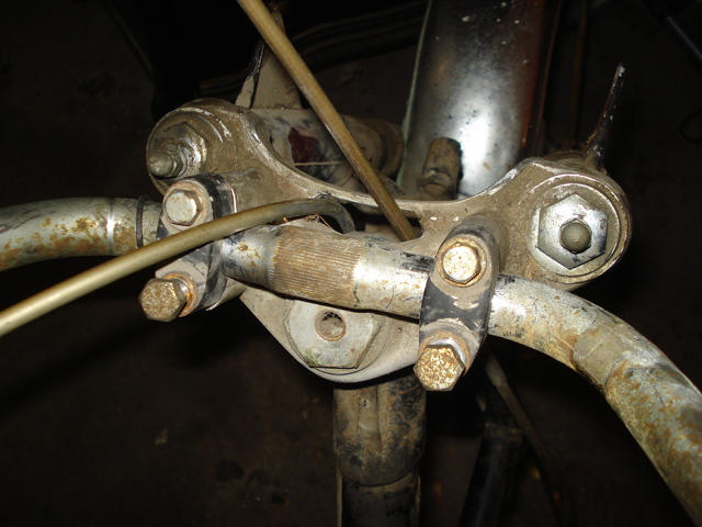It looks as though the top yoke (triple-tree top bridge) had been modified, probably to facilitate the cables' path after the 'engineered' headlamp was fitted. The handlebar isn't correct for a CB; could be from a CA (touring), with those centred splines(?).