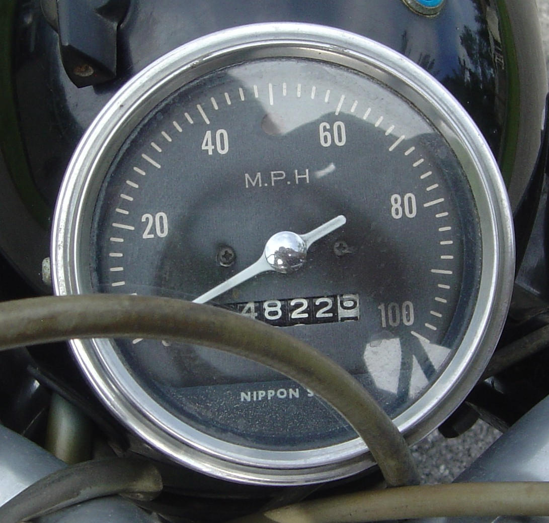 The speedo on my '67 CL77 worked fine, but the face had a strange dark pattern on it and the number 1 on the 10K odo wheel was almost all black. I thought that perhaps the face was faded and for some reason faded unevenly and the odo wheel numbers were deteriorating. The screws that held the face tight were a bit loose and the face would vibrate just a little when the bike ran. I was going to look for a place to send it out, but read all the various speedo threads here (especially Gman's, THANKS!) and with monsoon type rains falling today, figured it was a good day to go in the shop and play with the speedo. Here's what I encountered as I took it apart.