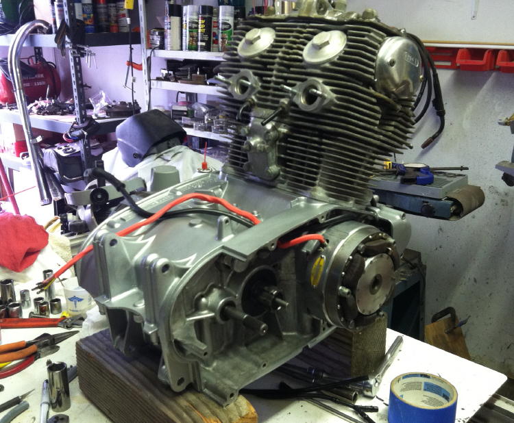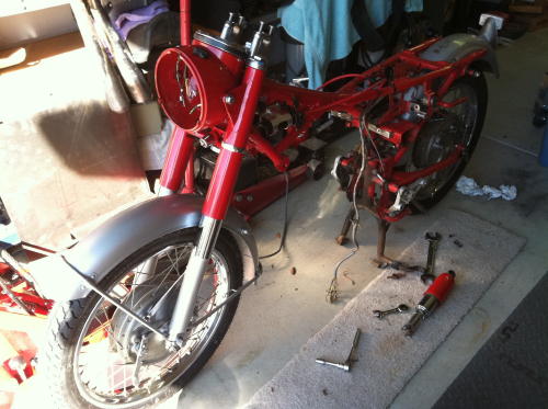 frame painted, front end mostly done, motor mostly done. Swing arm, center stand on. Working on harness.