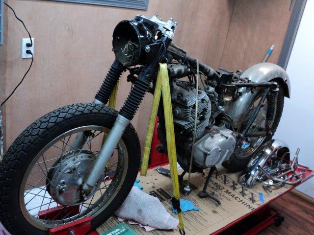 Well, the first photo seemed to work (thanks to the person that explained how to resize a photo using email) so here's another of the work in progress. It's a 1967 CL77 with 22,000 miles showing and lots of welding. Inside of side covers and underside of tank show it was a Candy Orange bike originally.Image