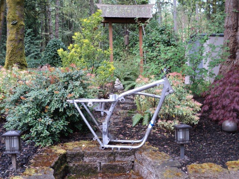 Bike is down to bare frame. Have spent last month cleaning, fixing, polishing and replacing individual parts. Had to re-weld the brake switch mounting bracket and the brake arm switch activator as they had been broken and re-welded improperly. Also had to use helicoils on the step bar mounting points as previous owner had drilled them out and used nut and bolt inserted backwards to attach the also broken step bar. Gathered lots of good parts off eBay and was even gifted one, hard to find part, from one of our members.