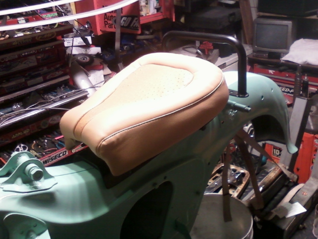 that had the look I was after...I dont want to sit up real high like the stock seat but didnt want my ass directly on the frame either-I built a seat base from 3/16 alum flat stock and bent it to match the frame contours-I used a seat pan off of a 68 yamaha 80 and using the stock seat mounts I