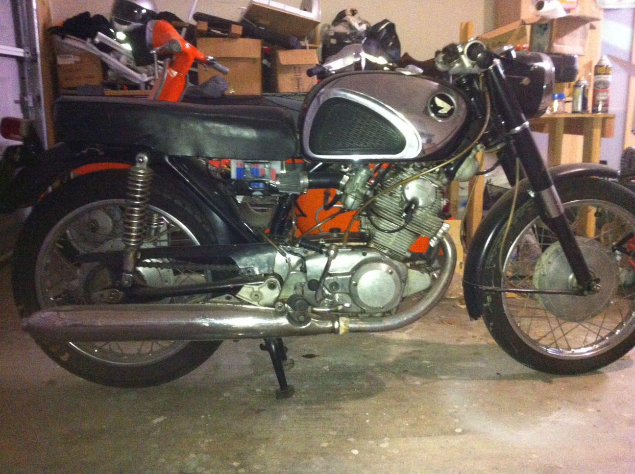 I'm unsure of the year, haven't looked at the title yet, but i'm pretty sure it's 66-68. It was running when he bought it, but he never rode it to a lighting problem. He did fix the lighting problem, but it had sat too long, the carbs needed work, and he didn't have time for it.