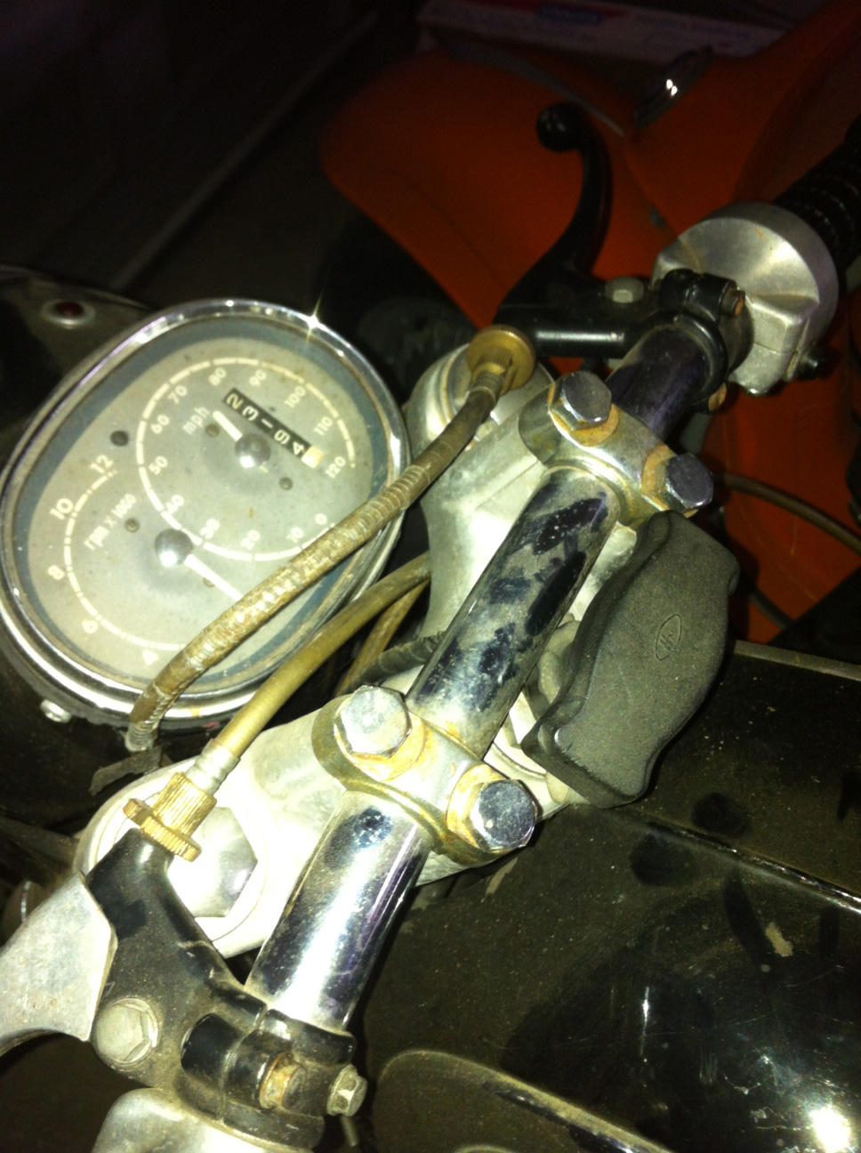 23xxx original miles? possibly, the license plate is from 1984. What is the brass looking hardware above the speedo on the left side, opposite what I assume is a red light of some kind.