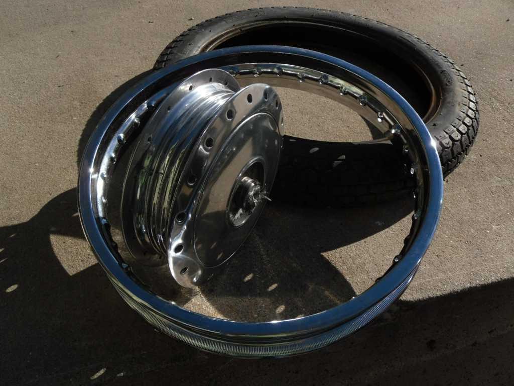 Just finished polishing the front hub and got two new rims and chrome spokes and nipples. Now to find a tire.