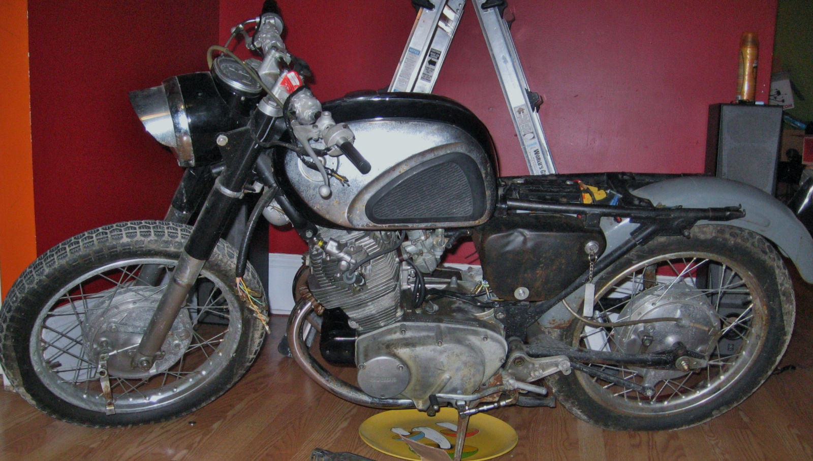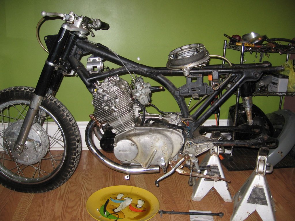 An acquaintance had it in a warehouse shop that parted out bikes and gave it to me as in the picture about 4 years ago. I was going through a bad time with my now ex wife and knew it would probably be a good source of therepy further down the road. boy was I right. Its mostly complete, but it was basically being scavenged for nuts and bolts from other guys at the shop that needed parts for their projects. Its missing alot of wierd stuff like brake torsion bar bolt and all the brake linkage nuts and bolts along with the seat and all the mounting hardware for the seat, pegs, mufflers, 1 rear shock and a bunch of misc. parts. Now that it runs, its home and getting ready to be cleaned up, frame repainted, engine and metals polished and put back together. Im making a list of all parts that need replaced and will be searching for everything over the winter. Im going to keep it mainly stock and try improving the charging system and looking for LED alternatives for lights and such. Not an engine guy so that will come next year when i have it ready to go. It sounds pretty good though. I also have an old honda dream that runs but it needs a fuul blown restore. Sorry for the rambling. Any info you might have would help.