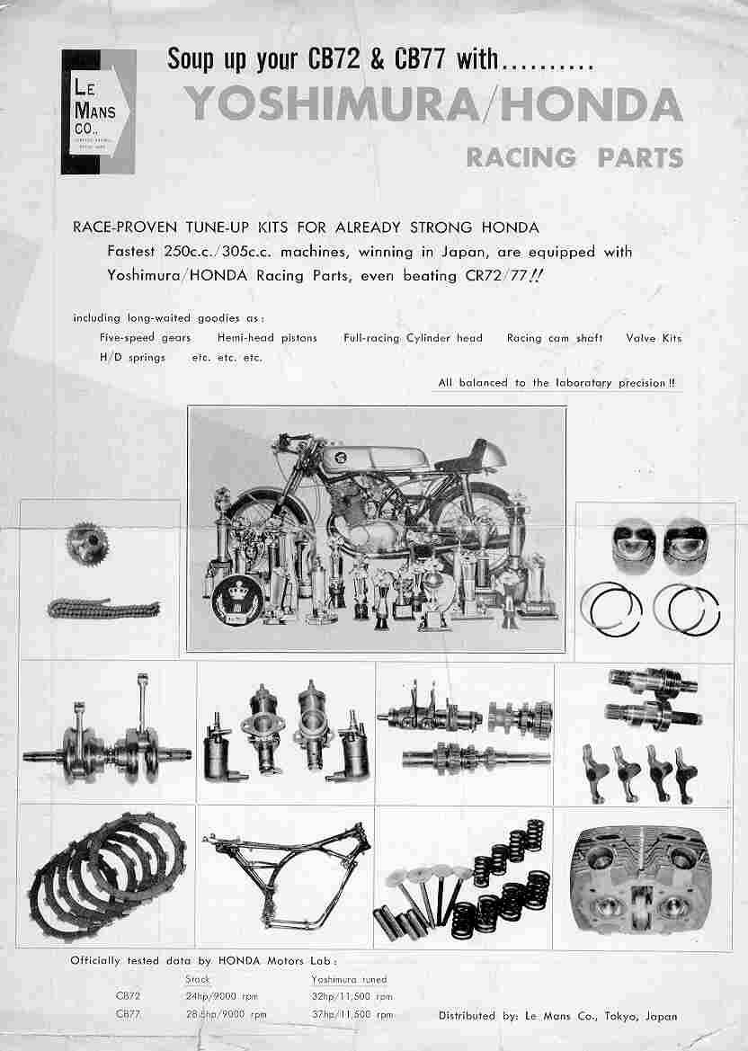 A friend of mine recently emailed me a brochure of a Yoshimura kit for the CB 72/77 produced by Le Mans Coy. Tokyo Japan. It is pretty comprehensive. Unfortunately, the paper is water marked and not easy to reproduce. Is anyone familar with the kit or any of the information it includes? I am happy to forward my copy but it is not in very good condition to reproduce. Any replys would be appreciated. It is amazing what turns up after all this time!