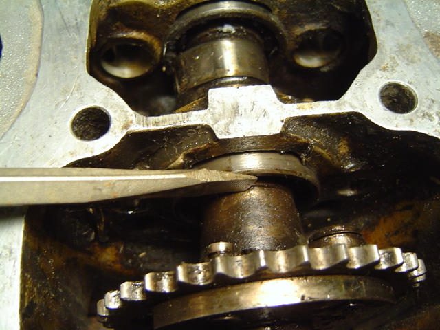 OK, I have began the teardown of the cylinder head and have removed both cylinder head side covers, Inlet/Exhaust rocker arm pins, and the right side cam shaft. I cannot, however, remove the left cam shaft. It will not release from the Cam Sprocket. Any suggestions? (See photos)