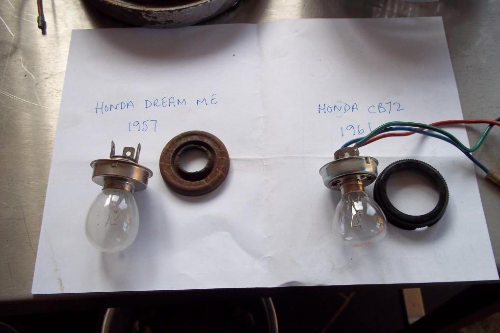 hi all.my honda m e had the headlamp bulb blown, and have been looking for one world wide, no luck, its a 3 pin fixing 6v 25/25, i have found 6v 25/25 but they have 2 contact points, so looking round, to see whats about, i took the headlamp off my cb72 1961, which has the 2 point conection, but which fits into a holder, i tryed that holder into the headlanp of the early dream and it fits, i can now take the 12v bulb from the cb72 out and replace it with the 6v 25/25 ones i have.will post a pic of the parts. alan