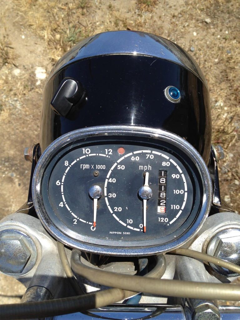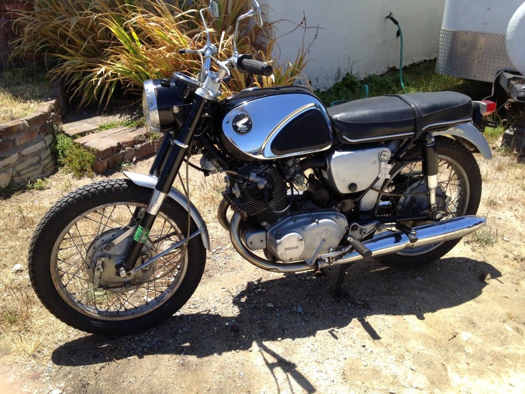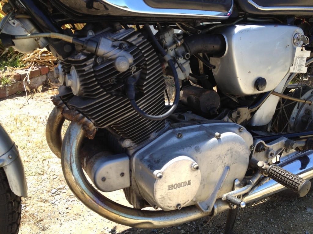 After many years, I'm about to finally get started on bringing back my 1966 CB77. She's a black 305 Super Hawk. I've owned her since 1971, and I took her off the road in 1975 when one cylinder went bad (18182 miles). She was my first motorcycle, and yes, I kept her all these years intending to get her running and on the road again. After sitting all that time, she's really rough, as expected. Some of the issues are: a bad cylinder (I don't know what's wrong - oil comes out from around the spark plug); broken speedometer glass; dented headlight bucket and bent headlight bezel; dent on the top of the gas tank; cracked and checked intake boots; rotted air filters; rusty rims; bad tires; rotted mufflers; etc, etc, etc. Despite all that, she's really not as bad as she sounds. The engine, except for the one cylinder, is sound, The transmission is (or was) good, the paint on the frame is good, the seat is good, the fenders are good (the front one was bobbed, but it's okay), the side panels are good, and most of the wiring and cables are good.