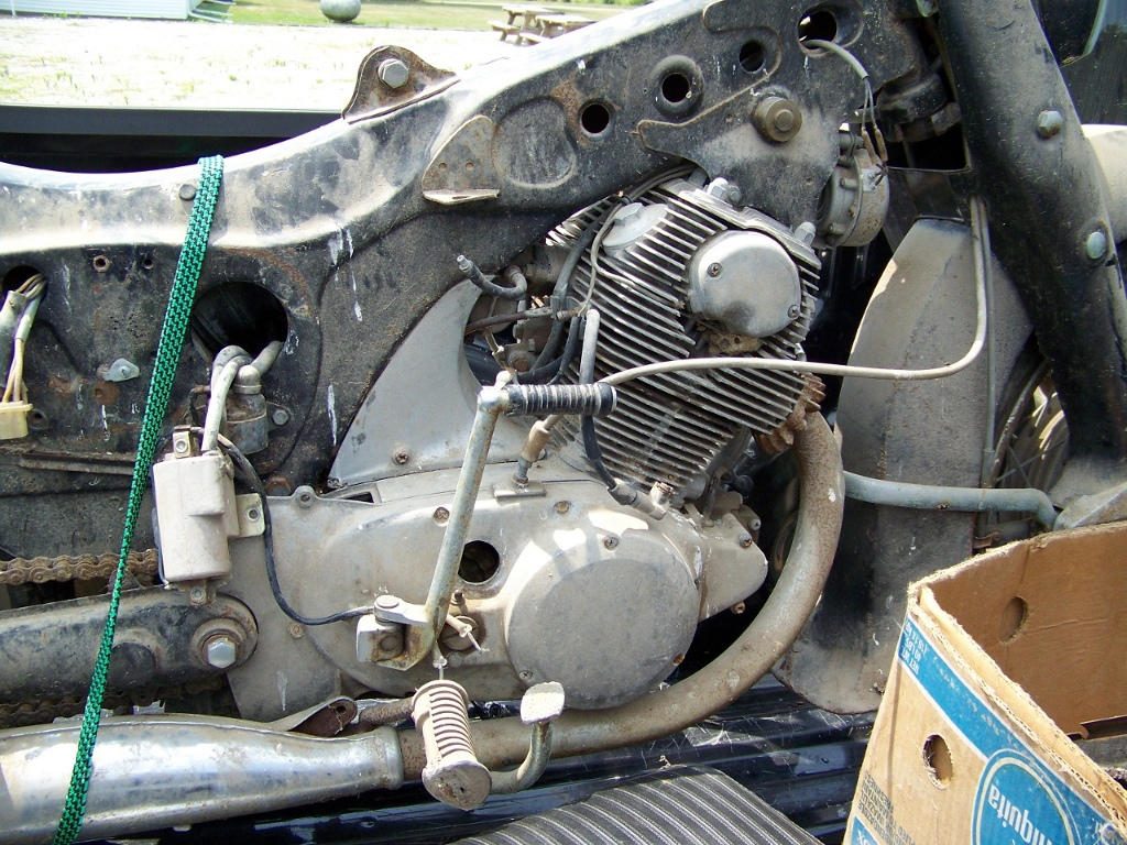 I picked it up today. I haven't seen the title yet, as he's still looking for it, and I can't quite make out the odometer reading, but I think it's around 20,000 miles. "In boxes" referred to the seat, tank, side panels and sundry other small bits; the chassis still rolls, though the back tire won't hold air. Sadly, at some point or another, my cousin's son set out to restore it, and lost interest after barely starting (hence the boxed parts). He removed the plugs along the way... I have only one of them, and it's broken.