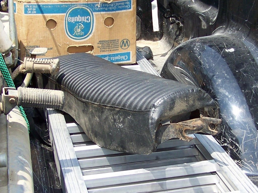 Seat. Has been recovered, no strap or chrome strip; I can live without them, but the foam is shot so it gets redone anyway.