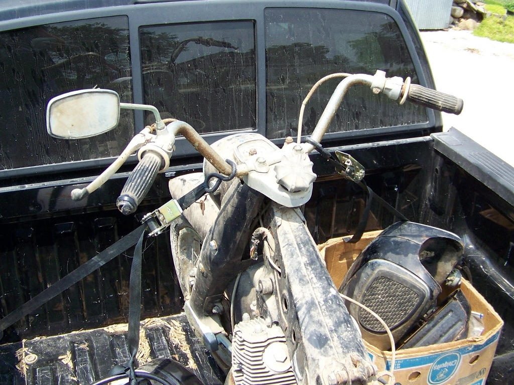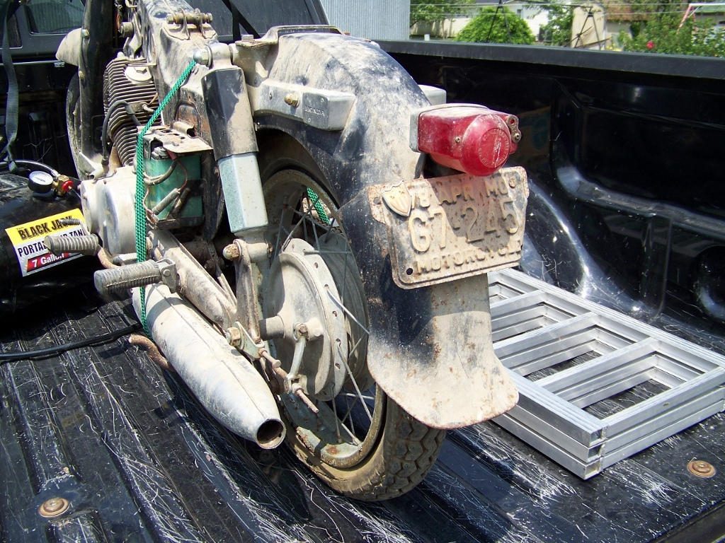 He told me the frame was cracked; when I picked it up, the only crack I can see is in the rear fender, which I'm told is a common issue. Given the rust spots all over the frame, I think stripping it down to the frame and getting it repaired and repainted is the smart thing to do. Given that I'll have to do that, I'm considering repainting it Honda red. Not all that excited about black.