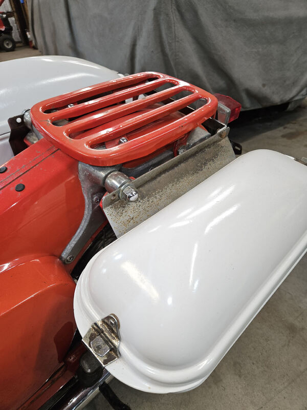 Thank you Dan, that is correct set up for a Dream, nice to know that they do exist. I have found one mounting bracket (where the bag pins go through and turn into place) and fabricated one of the down braces that has the bent bar that snaps into the bottom of the bag that I was missing. The pin brackets that came with my set did not have the correct angles, the hole spacing was the same, but they did not kick out enough to clear a Dream top shock bolt. With a lot of heat, hammering, and bending I got them to work after completely flattening them and reshaping. I also fabbed up a couple of muffler brackets out of aluminum strapping. The set is not pretty, but will work. I am still looking for factory correct system for a Dream CA77, but if one is not out there I will go with me fabricated set up.;.