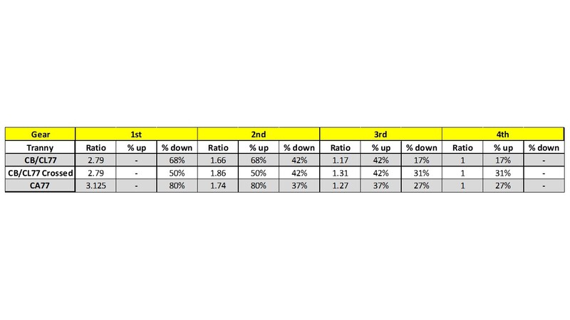 Here is a table I put together showing the 3 options for gearing. Granted there are other options if you want to take CA gears and use them in the CB/CL tranny. But for my purposes, these 3 choices were all I considered when I started down this path.