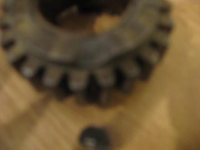 Hello all, thought i would go the whole hog and overhaul the transmision as well and found that on third gear (23 teeth countershaft) i believe, has a dog missing, found it wedged in the corner near oil pump totally covered in solid gunk. I measured the dog size against the ones still on the gear and it seems that it went astray a long time ago. Took a picture of the gear and i appologise for poor quality. Any one got a 23 tooth third gear for sale please if so can you please email me many thanks.